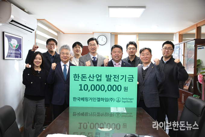 한국베링거인겔하임동물약품㈜(대표이사 서승원)은 지난 8일 한돈협회를 방문해 한돈산업 발전기금 1000만원을 기탁했다.