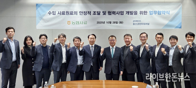농협사료는 지난달 28일 서울 포스코센터에서 정종대 대표이사와 임재성 포스코인터내셔널 소재바이오본부장 등이 참석한 가운데 전략적 업무협약(MOU)을 체결했다고 밝혔다. 이번 협약은 2022년 11월 첫 협약을 시작으로 4년째 이어지고 있으며 미중 무역갈등 등 글로벌 곡물 시장의 불확실성이 지속되는 가운데 국내기업 간의 협력을 통해 원료의 안정적 확보와 축산농가 경쟁력 강화라는 공동의 목표를 담고 있다.