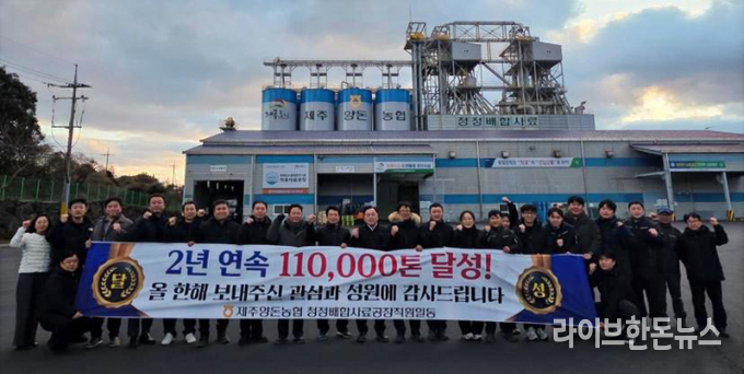 제주양돈농협 청정배합사료공장은 2년 연속 사료 판매량 11만 톤을 달성했다고 지난 6일 밝혔다.