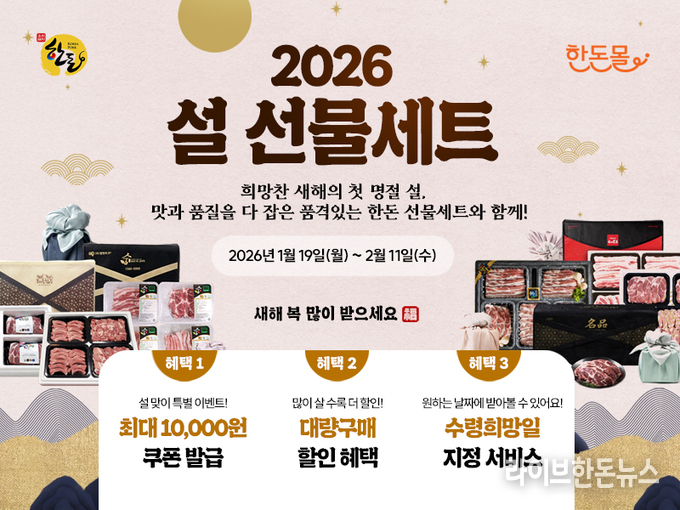 행사기간 동안 한돈몰에서는 △설 선물세트 10~20% 할인 △대량 구매 주문 시 10~20% 추가 할인 △선물세트 구매 고객 대상 댓글 리뷰 이벤트 △신규회원가입 할인 쿠폰 및 설 할인 쿠폰 지급 등 다양한 혜택도 제공된다.